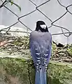 Mide 66 cm de largo incluida su cola que mide unos 46 cm. Ambos sexos son similares. La cabeza, cuello, y pecho son negros con una mancha blanca en su nuca; el resto del plumaje inferior es blanco, con algo de tono lila; todo el plumaje superior es de un color azul-púrpura, más brillante en las alas y la cola; sus plumas de vuelo poseen extremos blancos, y su lateral expuesto también es blanco; su cola es larga y gradual, las plumas son azules, con extremos blancos, todas excepto el par central poseen una banda negra por delante del blanco.