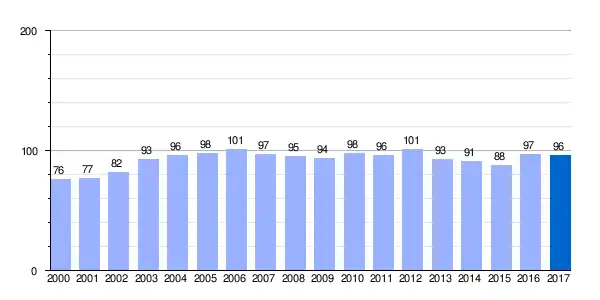 Gráfica de evolución demográfica de Urrúnaga[1] entre 2000 y 2017 |