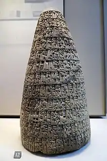 ![]() Fragmento de inscripción sobre cono de arcilla de Urukagina: "Él [Uruinimgina] excavó (...) el canal a la ciudad de NINA. Al principio, construyó el Eninnu (E-ninnu), al final, construyó el Esiraran". Museo del Louvre. | ||