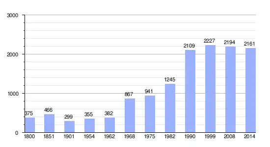 Los datos demográficos contemplados en este gráfico de la comuna de Urville-Nacqueville[4] se han cogido de 1800 a 1999 de la página francesa EHESS/Cassini, y los demás datos de la página del INSEE.[5]