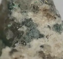Además de los elementos de su fórmula, suele llevar como impureza: cobre.