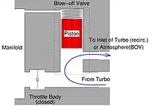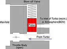 Una válvula de descarga está conectada a un manguito de vacío que va al colector de admisión, posterior a la mariposa del acelerador. Cuando se cierra el acelerador, la presión relativa del colector cae por debajo de la presión atmosférica y la diferencia de presión mueve el pistón de la válvula de descarga. El exceso de presión del turbocompresor se expulsa a la atmósfera o se recircula en el propio circuito del compresor, dependiendo del tipo de válvula.