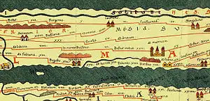 ![]() Parte de Vía Argentaria en el inserto del Tabula Peutingeriana | ||