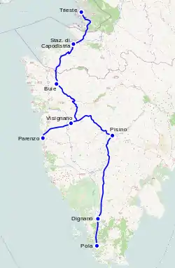 Nacía en Trieste, cruzaba Rižana, el río Dragonja y, en el Ponte Portón, el río más grande de Istria, el Mirna. Luego llegaba a Lim, Dvigrad, Bale, Vodnjan (Dignano) y Pula (Pola). En Pula el camino pasaba por el Arco de los Sergios, que antiguamente se encontraba en el puerto de Porta Aurata,[2] después de lo cual giraba hacia Nesactium, llegando al río Raša. Cruzando el río continuaba como un camino local a través de Labin y Plomin hasta Kastav, en donde se unía con la Vía Annia.