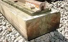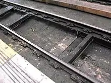 Desvío de una vía longitudinalmente apoyada, que muestra las vigas de madera (debajo de los carriles) y los travesaños (para mantener el ancho de vía)
