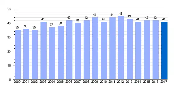 Gráfica de evolución demográfica de Vírgala Mayor[2] entre 2000 y 2017 |