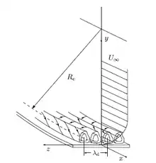 El inicio de los vórtices de Görtler se puede predecir utilizando el número adimensional denominado número de Görtler ( G ). Es la relación de los efectos centrífugos a los efectos viscosos en la capa límite y se define como:
