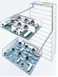 El Flujo de Refrigerante Variable (VRF), también conocido como Volumen de Refrigerante Variable (VRV), es un tipo de sistema de aire acondicionado central de tipo multi-split. Utiliza un refrigerante como medio de transmisión de frío y calor. Este refrigerante es acondicionado por una unidad externa de condensación y entonces circula por el edificio hacia múltiples unidades interiores.