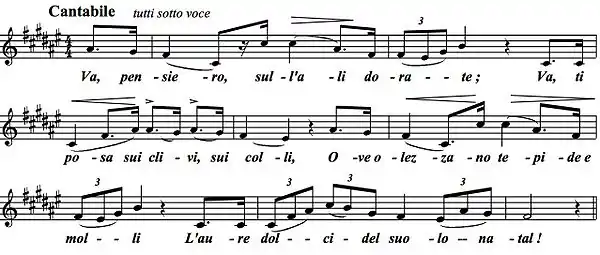 Va, pensiero es el coro del tercer acto de la ópera Nabucco, de Giuseppe Verdi, en fa♯ mayor, de 1842, con letra de Temistocle Solera, inspirada en el Salmo 137 «Super flumina Babylonis». Calificada como la «obra maestra de Verdi», canta la historia del exilio hebreo en Babilonia tras la pérdida del Primer Templo de Jerusalén. Este coro le dio fama al compositor.