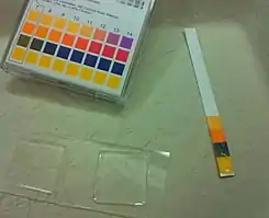 ![]() El tratamiento de la vaginosis bacteriana, con un indicador de pH para detectar la alcalinización vaginal (que en este caso muestra aproximadamente pH 8), y un portaobjetos de microscopio para detectar de forma microscópica las células indicadoras. | ||