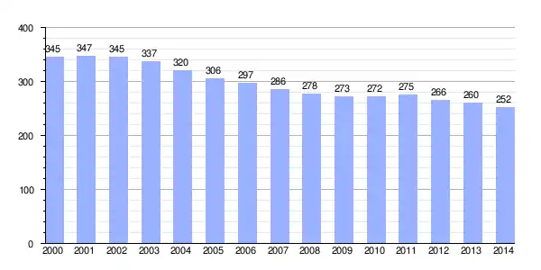 Gráfica de evolución demográfica de Valdesandinas[2] entre 2000 y 2014 |