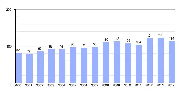 Gráfica de evolución demográfica de Valdesogo de Abajo[2] entre 2000 y 2014 |