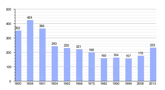 Los datos demográficos contemplados en este gráfico de la comuna de Valezan[4] se han cogido de 1800 a 1999 de la página francesa EHESS/Cassini, y los demás datos de la página del INSEE.[5]