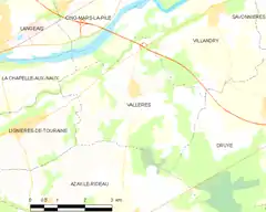 Vallères es una población y comuna francesa, situada en la región de Centro, departamento de Indre y Loira, en el distrito de Chinon y cantón de Azay-le-Rideau.