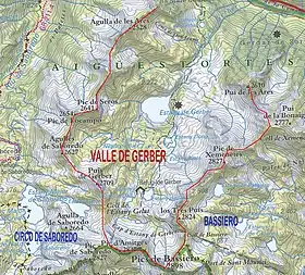 El valle de Gerber está cerrado por los siguientes picos, empezando por la derecha del río, la izquierda si se observa desde el valle de la Bonaigua: