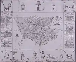 VALLE DE GUERRA. Lugar con ayuntamiento en la isla y diócesis de Tenerife, (...) partido judicial de la Laguna, de cuyo punto dista una legua (...). SITUADO en un valle distante una legua de la Laguna y rodeado de huertas y viñas; los vientos que mas reinan son los del SE, y su CLIMA es templado y saludable. Tiene unas 200 CASAS diseminadas por todo el término, pequeñas y de malísimo gusto; una fuente de buena agua de la que se surten los vecinos, y una escuela pública dotada con 4,600 reales de fondos de arbitrios, a la que concurren de 10 a 50 niños; carece de parroquia y sus habitantes asisten a la de la Concepción de la ciudad de la Laguna. Confina el TÉRMINO con la jurisdicción de Tegueste, Tegina, la Laguna y con el mar; el TERRENO, aunque de secano, es de bastante buena calidad, por el cual cruza un CAMINO que conduce a la ciudad de la Laguna y se halla en buen estado; la CORRESPONDENCIA se recibe de este punto por balijero. PRODUCCIÓN: trigo, maíz, patatas, legumbres, vino y frutas; se cría un poco de ganado de cerda, y se mantiene el de labor preciso para el cultivo de la agricultura, única INDUSTRIA que se conoce; hay caza de conejos, perdices y palomas. POBLACIÓN: 269 vecinos, 1,258 almas ...Pascual Madoz, 1849.[8]