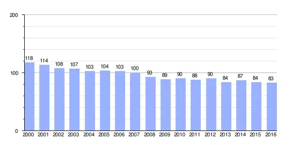 Gráfica de evolución demográfica de Valle de la Valduerna[2] entre 2000 y 2016 |