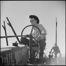 Una NYA foto que ilustra trabajadores de granja joven y la mecanización de agricultura.
