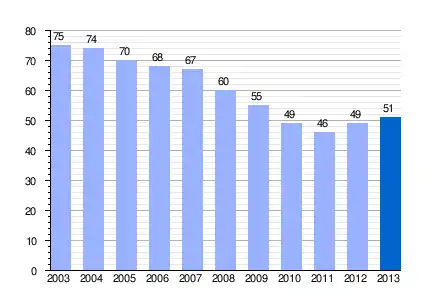 Gráfica de evolución demográfica de Vallequemado entre 2003 y 2013 |