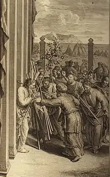 La vara de Aarón tuvo un papel a la hora de confirmar al hermano de Moisés como sacerdote. Dios mandó a Moisés que recogiera una vara seca de almendro de cada tribu y las pusiera al lado de Aarón, en el tabernáculo, solo la de éste floreció, cargándose luego de fruto, por lo cual fue depositada y guardada en el Arca Santa.Num 17:1-13