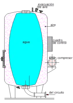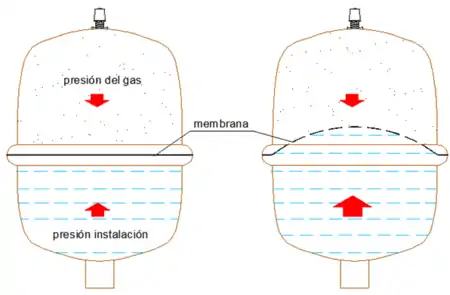 Consideremos un vaso como el de la figura. Tal como se ha dicho, en frío, las presiones en el lado del gas y en el lado de la instalación son iguales y la membrana permanece recta. A medida que la instalación se calienta, aumenta el volumen del agua contenida, lo que deforma la membrana elástica y comprime el volumen de gas, el cual disminuye tanto como aumentó el del agua. Según la ley de Boyle-Mariotte, la presión variará proporcionalmente y de forma inversa a la variación de volumen. Este aumento de presión tendrá que ser tal, que la presión final del circuito, no sobrepase la presión de timbre[5] del elemento de la instalación que la tenga más baja.