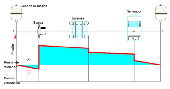 La línea roja de la figura adjunta recoge los valores de la presión a lo largo de una instalación de calefacción. La línea comienza en el punto de conexión del vaso de expansión, que es el que corresponde a la presión de referencia y termina en el mismo punto, ya que se trata de un circuito cerrado. En la bomba, la presión pasa de un valor inferior a la referencia[7] en la aspiración hasta alcanzar el punto más alto del circuito a la salida de la bomba. Posteriormente la presión se va reduciendo lentamente debido a las pérdidas de carga en la tubería hasta llegar a los emisores donde sufre una caída brusca debido principalmente a las restricciones en las válvulas de entrada y salida, ya que el radiador en sí mismo, apenas tiene pérdida de carga. Después de los emisores, sigue descendiendo la presión por la tubería, hasta sufrir otra caída vertical debida a la pérdida de carga de la caldera y terminar otra vez en la referencia.