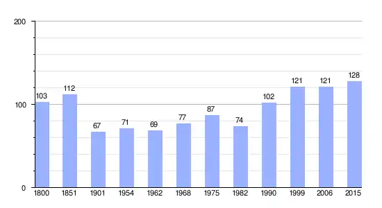 Los datos demográficos contemplados en este gráfico de la comuna de Vauchamps[4]se han cogido de 1800 a 1999 de la página francesa EHESS/Cassini, y los demás datos de la página del INSEE.[5]