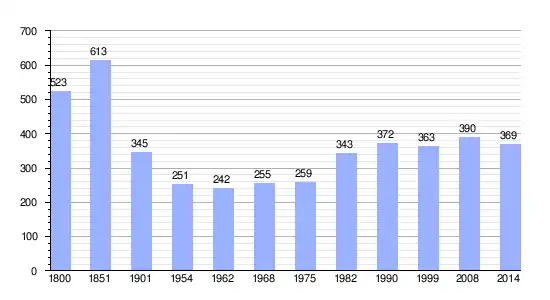 Los datos demográficos contemplados en este gráfico de la comuna de Vauville[4] se han cogido de 1800 a 1999 de la página francesa EHESS/Cassini, y los demás datos de la página del INSEE.[5]