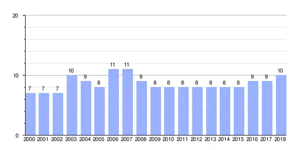 Gráfica de evolución demográfica de Veiga entre 2000 y 2018 |