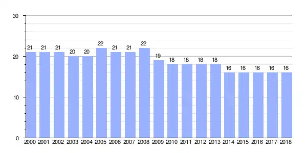 Gráfica de evolución demográfica de Veiga entre 2000 y 2018 |