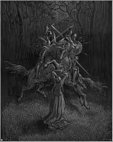 Étienne Souriau nos recuerda que en todas las historias heroicas, los caballos son los compañeros constantes de los héroes y son lo suficientemente importantes como para tener una personalidad, un personaje bien definido, así como su propio nombre, como Bayard y Veillantif.[58] Franck Évrard señala que las epopeyas homéricas, los cantares de gesta y las novelas de caballería reconcilian los valores caballerescos y religiosos y han contribuido a forjar una imagen simbólica del caballo y a darla a conocer. El autor lo ve como un «símbolo de virilidad e iniciación caballeresca», añadiendo que el caballo está a menudo vinculado a una dinámica vertical y ascendente como en el mito de Pegaso, dinámica que se encuentra en la historia heroica. Además, como se destaca en varias novelas, el jinete desposeído de su caballo es un ser disminuido. [59]
