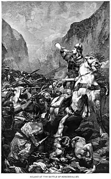 Según Robèrt Lafont, el descubrimiento del cuerpo de Oliveros por Roldán, que estaba desmayado en su caballo en ese momento, contribuyó a ralentizar la acción.[22] Roldán, Turpin y Gautier defendieron entonces la línea de cresta contra cientos de sarracenos, y Roldán permaneció solo en el campo de batalla después de la muerte de toda la retaguardia. Hizo sonar su olifante para advertir a Carlomagno, y luego sufrió docenas de ataques. Veillantif recibió una treintena de heridas y se desplomó bajo él, muerto.[23]