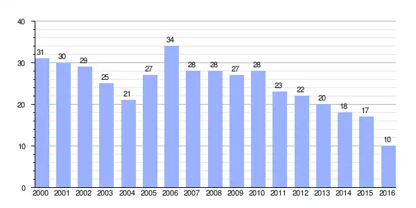 Gráfica de evolución demográfica de Velilla de la Valduerna[2] entre 2000 y 2016 |
