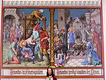 ![]() Venancio es quemado y lanzado a los leones. Mural de la Iglesia de San Venancio, Horgenzell. | ||