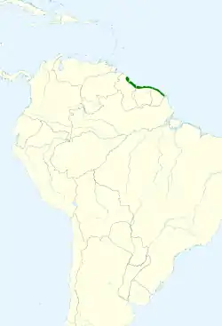Se encuentra solo en una franja costera de unos 140–180 km de ancho en Guyana, Surinam y la Guayana francesa.