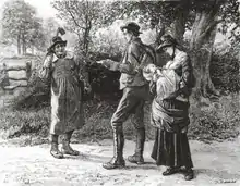 «The Duke of Chandos, while staying at a small country inn, saw the ostler beating his wife in a most cruel manner; he interfered and literally bought her for half a crown. She was a young and pretty woman; the Duke had her educated; and on the husband's death he married her. On her death-bed, she had her whole household assembled, told them her history, and drew from it a touching moral of reliance on Providence; as from the most wretched situation, she had been suddenly raised to one of the greatest prosperity; she entreated their forgiveness if at any time she had given needless offence, and then dismissed them with gifts; dying almost in the very act».[20] «El duque de Chandos, durante su estancia en una pequeña posada rural, vio al mozo de cuadra golpear a su esposa de la manera más cruel; intervino y, literalmente, compró a la mujer por la mitad de una corona. Era una mujer joven y bonita, el duque cuidó su educación y, tras la muerte del marido, se casó con ella. En su lecho de muerte [la mujer] reunió a toda la servidumbre de la casa, les contó su historia, y concluyó el relato con una moraleja de confianza en la Providencia, ya que, a partir de la situación más miserable, había sido llevada de repente a una de la mayor prosperidad; suplicó su perdón si en algún momento les había ofendido, y luego los despidió con regalos, muriendo casi en el acto mismo». — The Gentleman's Magazine (1832) |