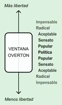 La ventana Overton es una teoría política que representa un ideario aceptable por el público como una ventana estrecha, afirmando que la viabilidad política de una idea se define principalmente por este hecho antes que por las preferencias individuales de los políticos. Se denomina de esta manera por Joseph P. Overton,[1] exvicepresidente del Centro Mackinac de Política Pública.[2] Para cada momento, esta "ventana" incluye un rango de políticas aceptables de acuerdo al clima de la opinión pública, que un político puede recomendar sin ser considerado demasiado extremista para poder ocupar o mantener un cargo público.