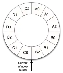 En comparación, la arquitectura SPARC de Sun Microsystems proporciona visibilidad simultánea en cuatro conjuntos de ocho registros cada uno. Tres conjuntos de ocho registros cada uno son "de ventana". Ocho registros (i0 a i7) forman los registros de entrada al nivel de procedimiento actual. Ocho registros (L0 a L7) son locales al nivel de procedimiento actual, y ocho registros (o0 a o7) son las salidas del nivel de procedimiento actual al siguiente nivel llamado. Cuando se llama a un procedimiento, la ventana de registro se desplaza en dieciséis registros, ocultando los registros de entrada antiguos y los registros locales antiguos y haciendo que los registros de salida antiguos los registros de entrada nuevos. Los registros comunes (registros de salida antiguos y nuevos registros de entrada) se utilizan para pasar parámetros. Finalmente, ocho registros (g0 a g7) son visibles globalmente para todos los niveles de procedimiento.