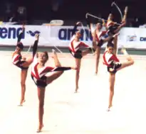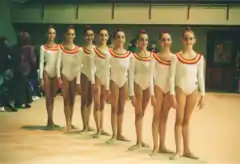 ![]() Verónica (4.ª a la izqda.) con el conjunto júnior en el Gimnasio Moscardó (1991). Selección españolaConjunto júnior1991