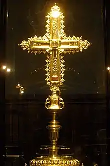 La cruz, de 20 × 18 cm, está protegida por un relicario gótico de oro y otro de plata del siglo XVIII. Esta pieza destaca por su valor histórico, religioso y artístico.