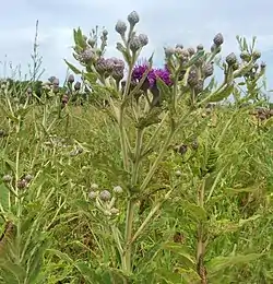Alcanza un tamaño de 0.91 a 1.5 m de alto y 0,91 a 1,2 m de ancho,[2] y, en algunos casos, la planta puede exceder un máximo de 1,8 m. Las hojas de la planta son de color verde oscuro y se dispones de forma alterna.[3] Las flores se producen de julio a agosto, y son de color magenta rojizo-marrón, con brácteas. Cada flor tiene 30-60 flósculos en el disco. Tienen tronco central grueso que está cubierta de pelos blancos. Las flores crecen cerca una de otra y no tienen radios. Sus tallos son pubescentes y de color marrón rojizo en color.[3]