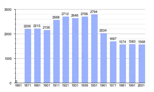 Desde 1871 se mantuvo un ligero ascenso de la población en la comuna hasta el máximo de 2794 alcanzado en 1951. A partir de ese momento la población ha decaído hasta el mínimo de 1568 en el comienzo del año 2000.