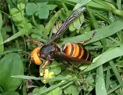 En Japón, los apicultores prefieren a menudo las abejas europeas, ya que son más productivas que las abejas japonesas endémicas. Sin embargo, es muy difícil mantener una colmena de abejas europeas, ya que los avispones gigantes son devastadores para las colmenas de abejas. Una vez que un avispón gigante japonés ha localizado una colmena de abejas europeas, deja marcadores de feromonas a su alrededor que atraen rápidamente a sus compañeros del nido para entre todos converger la colmena. Un avispón gigante japonés puede matar a cuarenta abejas europeas en un solo minuto; un grupo de treinta avispones puede destruir una colmena entera de unas treinta mil abejas en poco más de tres horas. Los avispones matan y desmiembran a las abejas. Al regresar a su nido, llevan consigo el tórax de las abejas para alimentar a sus larvas, dejando las cabezas y extremidades atrás. También se llevan la miel y las larvas de abejas para alimentar a sus propias larvas.