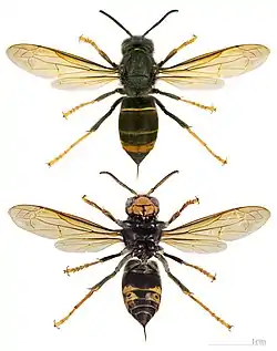 - Megascolia maculata (en la foto, la raza oriental, que tiene rojizo el extremo del abdomen, mientras que la raza del Mediterráneo occidental tiene negro dicho extremo)