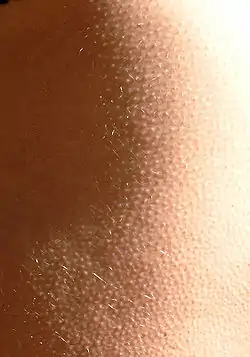 Los humanos también tienen algunos comportamientos y reflejos vestigiales.[63] Por ejemplo, la formación de piel de gallina en humanos bajo estrés es un reflejo vestigial; una posible función de los ancestros evolutivos humanos era elevar el pelo del cuerpo, hacer que el antepasado pareciera más grande y ahuyentar a los depredadores.[64][63] Levantar el cabello también se usa para atrapar una capa extra de aire, manteniendo a un animal caliente.[63] Debido a la disminución de la cantidad de cabello en los humanos, la formación refleja de la piel de gallina cuando está fría también es vestigial.[63]
