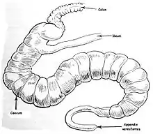 En los humanos modernos, el apéndice vermiforme es un vestigio de un órgano redundante que en las especies ancestrales tenía funciones digestivas, al igual que lo hace en las especies existentes en las que la flora intestinal hidroliza celulosa y materiales vegetales indigeribles similares.[9] Algunos animales herbívoros, como los conejos, tienen un apéndice vermiforme terminal y ciego que aparentemente tienen parches de tejido con funciones inmunitarias y también pueden ser importantes para mantener la composición de la flora intestinal. Sin embargo, no parece tener mucha función digestiva, y no está presente en todos los herbívoros, incluso en aquellos con grandes ciegos.[10] Sin embargo, como se muestra en las imágenes adjuntas, el apéndice humano es casi comparable al tamaño del conejo, aunque el ciego se reduce a un único bulto donde el íleon desemboca en el colon.[6] Algunos animales carnívoros también pueden tener apéndices, pero rara vez tienen más que ciegos vestigiales.[11] En línea con la posibilidad de que los órganos vestigiales desarrollen nuevas funciones, algunas investigaciones sugieren que el apéndice puede proteger contra la pérdida de bacterias simbióticas que ayudan a la digestión, aunque es poco probable que sea una función nueva, dada la presencia de apéndices vermiformes en muchos herbívoros.[12][13] Las poblaciones de bacterias intestinales atrincheradas en el apéndice pueden apoyar el restablecimiento rápido de la flora del intestino grueso después de una enfermedad, envenenamiento o después de que un tratamiento con antibióticos agota o causa cambios nocivos en la población bacteriana del colon.[14] Un estudio de 2013, sin embargo, refuta la idea de una relación inversa entre el tamaño del ciego y el tamaño y la presencia del apéndice. Está ampliamente presente en euarchontoglires (un superorden de mamíferos que incluye roedores y primates) y también ha evolucionado convergentemente en los marsupiales diprotodontes, monotremas, y es muy diverso en tamaño y forma, lo que podría sugerir que no es vestigial. Los investigadores deducen que el apéndice tiene la capacidad de proteger bacterias buenas en el intestino. De esta forma, cuando el intestino se ve afectado por una diarrea u otra enfermedad que limpia los intestinos, las bacterias buenas en el apéndice pueden repoblar el sistema digestivo y mantener a la persona sana.[15]
