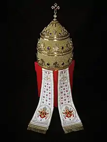 Un elemento que Benedicto XVI no usó durante su papado es la tiara papal. Al igual que sus dos predecesores inmediatos, optó por no ser coronado con la tiara en su misa de inauguración, ni la usó desde entonces. A diferencia de ellos, no obstante, hizo hincapié en la decisión de romper con la tradición previa en el uso de una mitra en lugar de la tiara en su escudo papal. Sin embargo, fue obsequiado con una clásica tiara, regalo de la Colección Phillipi que nunca usó. En una ocasión, san Juan Pablo II fue obsequiado en Hungría con una tiara papal. Benedicto Tampoco usó otras prendas pontificias tradicionales, como los guantes y las pantuflas papales.