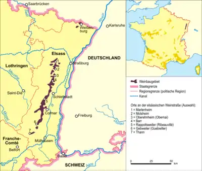 Mapa de Alsacia con la ubicación de la región vitícola y algunos pueblos marcados.