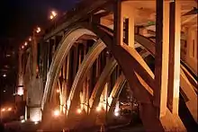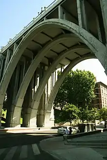 El viaducto de Segovia o viaducto de la calle Bailén se encuentra en la ciudad española de Madrid.[2] Existió uno anterior, construido en la década de 1930 para sustituir a otro de hierro erigido en 1874.[3] El actual es fruto de numerosas restauraciones realizadas con el objeto de acomodar sus estructuras a la creciente demanda de tráfico. La finalidad del viaducto de Segovia es la prolongación de la calle de Bailén, situada en su parte superior, y salvar el desnivel de la calle de Segovia, que discurre perpendicularmente a sus pies, uniendo la zona del Palacio Real con las Vistillas. Toma su nombre de esta última vía, aunque se le conoce popularmente como «el viaducto». Ya desde sus inicios fue un símbolo popular para suicidarse en Madrid (por eso se denominó también como el puente de los suicidas).[4]