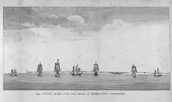 - el HMS Wager [Apuesta], una sexta clase fletado en 1734, con 37 m de eslora y 599 toneladas, 24 cañones y 120 hombres;